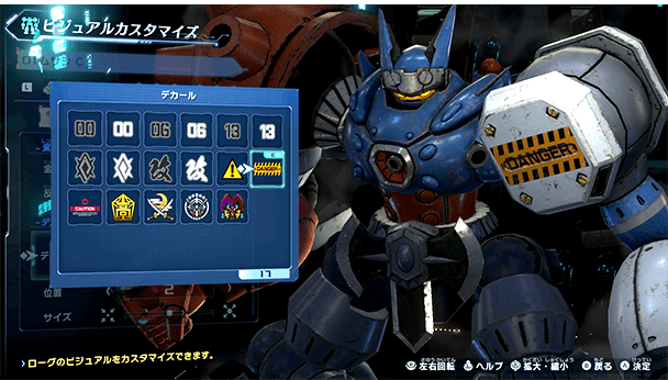 「デカール」と呼ばれるパーツを機体に貼ることもでき、位置やサイズも変更可能!